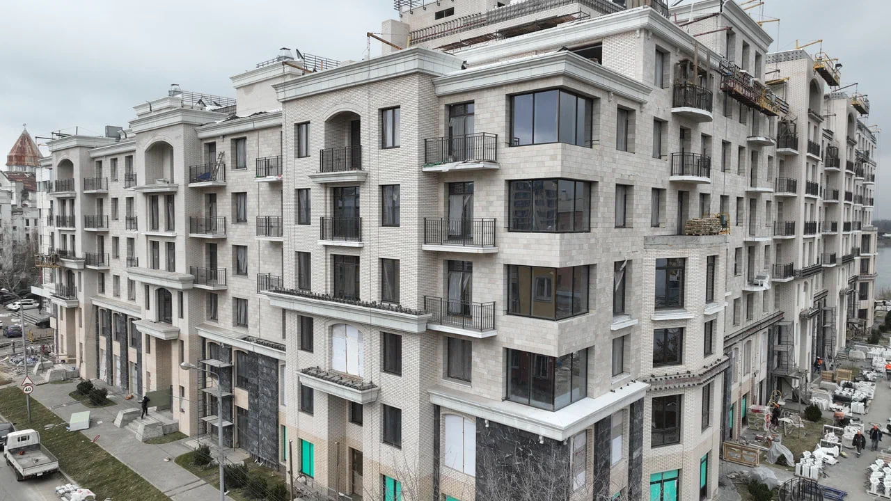 Вечная ценность. Основной фасад - натуральный Аркасский мрамор теплого бежевого оттенка с неповторимой текстурой. Первый и второй этажи - натуральный Гранит Амфиболит с гранатовыми вкраплениями. Подсистема являющаяся основой фасада фирмы Hilti (Лихтенштейн) сделана из алюминия, не подвержена коррозии, имеет срок службы более 100 лет. Ливневая канализация террас сделана из нержавеющей стали, скрыта под фасадом и не требует обслуживания