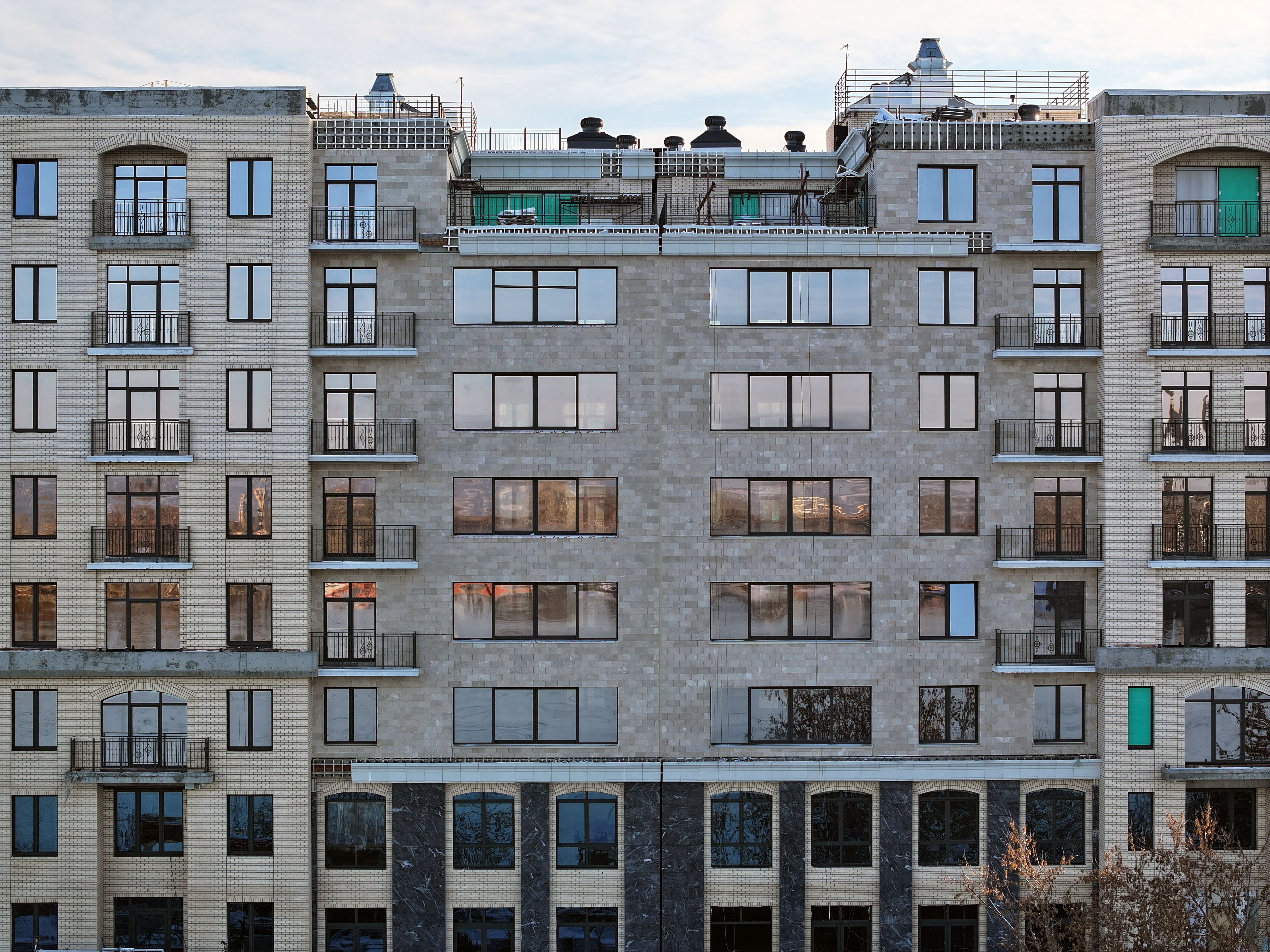 Вечная ценность. Основной фасад - натуральный Аркасский мрамор теплого бежевого оттенка с неповторимой текстурой. Первый и второй этажи - натуральный Гранит Амфиболит с гранатовыми вкраплениями. Подсистема являющаяся основой фасада фирмы Hilti (Лихтенштейн) сделана из алюминия, не подвержена коррозии, имеет срок службы более 100 лет. Ливневая канализация террас сделана из нержавеющей стали, скрыта под фасадом и не требует обслуживания