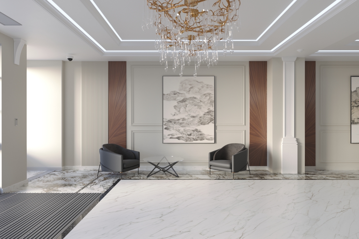 Элегантные парадные выполнены в современном стиле, с деталями, актуальными времени. Интерьеры подчеркивают произведения искусства, создавая атмосферу истинной роскоши. Винтовые трехпролетные лестницы с естественным освещением через светопрозрачные фонари от бельгийской компании Reynaers Aluminium в кровле. Придают подъездам индивидуальность и утонченность.