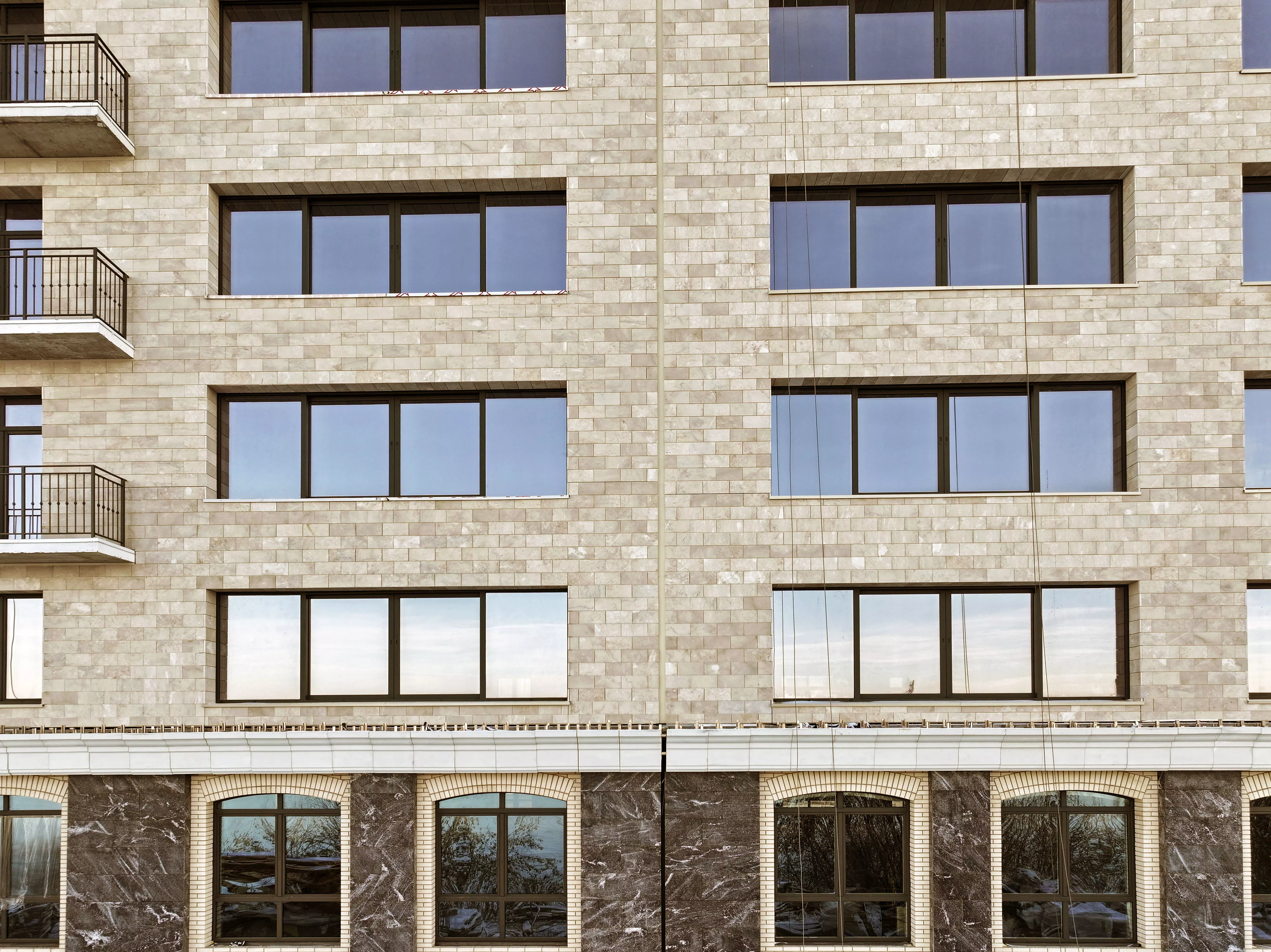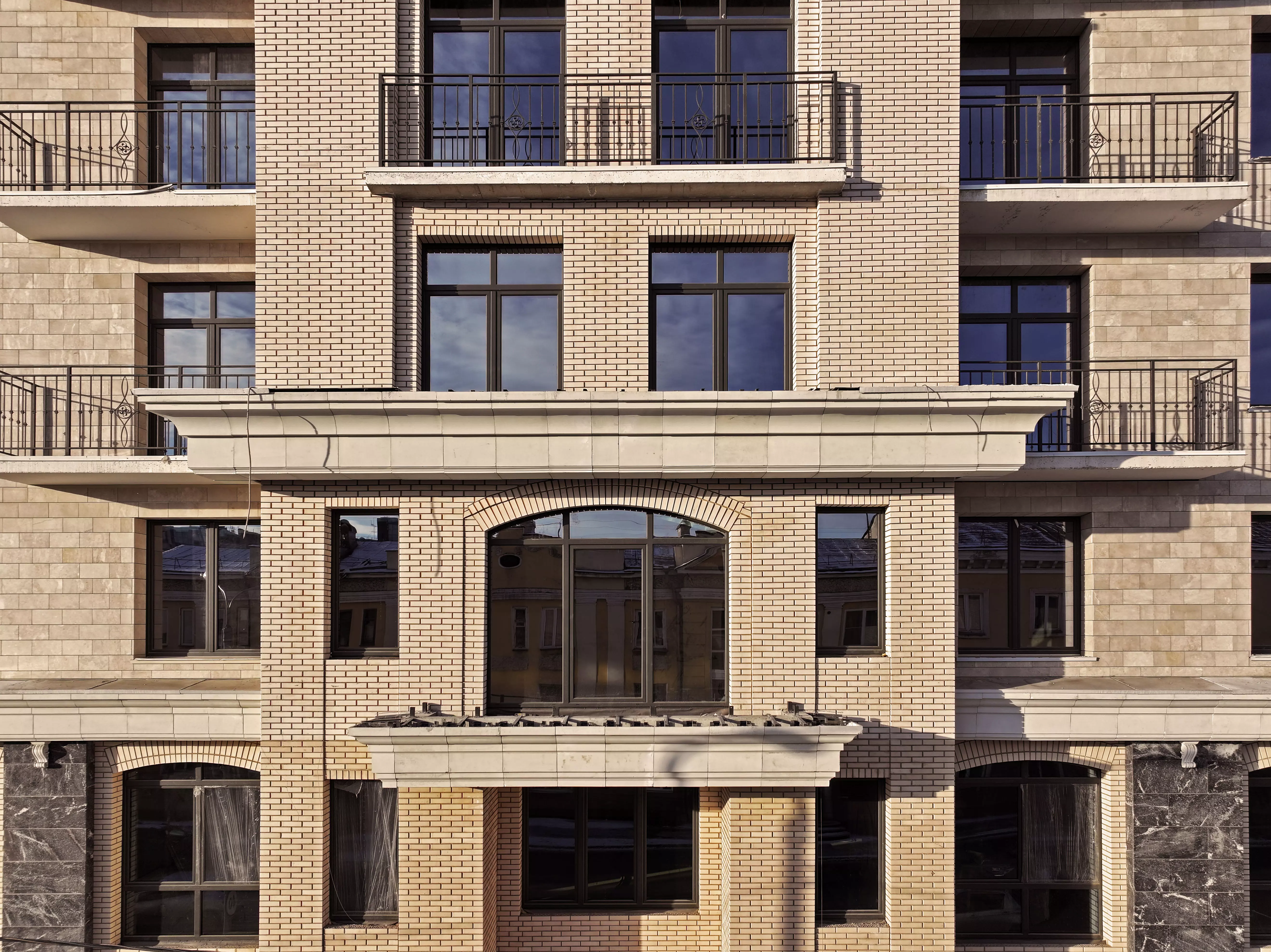 Вечная ценность. Основной фасад - натуральный Аркасский мрамор теплого бежевого оттенка с неповторимой текстурой. Первый и второй этажи - натуральный Гранит Амфиболит с гранатовыми вкраплениями. Подсистема являющаяся основой фасада фирмы Hilti (Лихтенштейн) сделана из алюминия, не подвержена коррозии, имеет срок службы более 100 лет. Ливневая канализация террас сделана из нержавеющей стали, скрыта под фасадом и не требует обслуживания